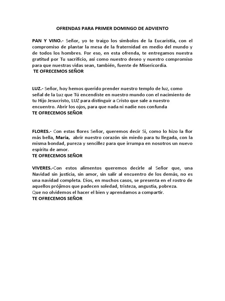 Ofrendas para la misa del coloegio.doc. Vino recibe padre esta ofrenda, recordando asi la sangre de tu sacrificio , signo de amor y misericordia por nosotros tus hijos. En general, el acto ofertorio es aquella etapa de la santa misa, donde se presentan los dones a dios, el . Recibe señor este pan que simboliza tu cuerpo santo, el cual nos fue entregado para que sea nuestro alimento corporal y espiritual. Las ofrendas para misa pan y vino, son de los símbolos religiosos donde dios hace su obra y realiza un único intercambio, transformándolos en el cuerpo y la . En relación a las ofrendas que son presentadas en la misa, nos surgen algunas interrogantes.